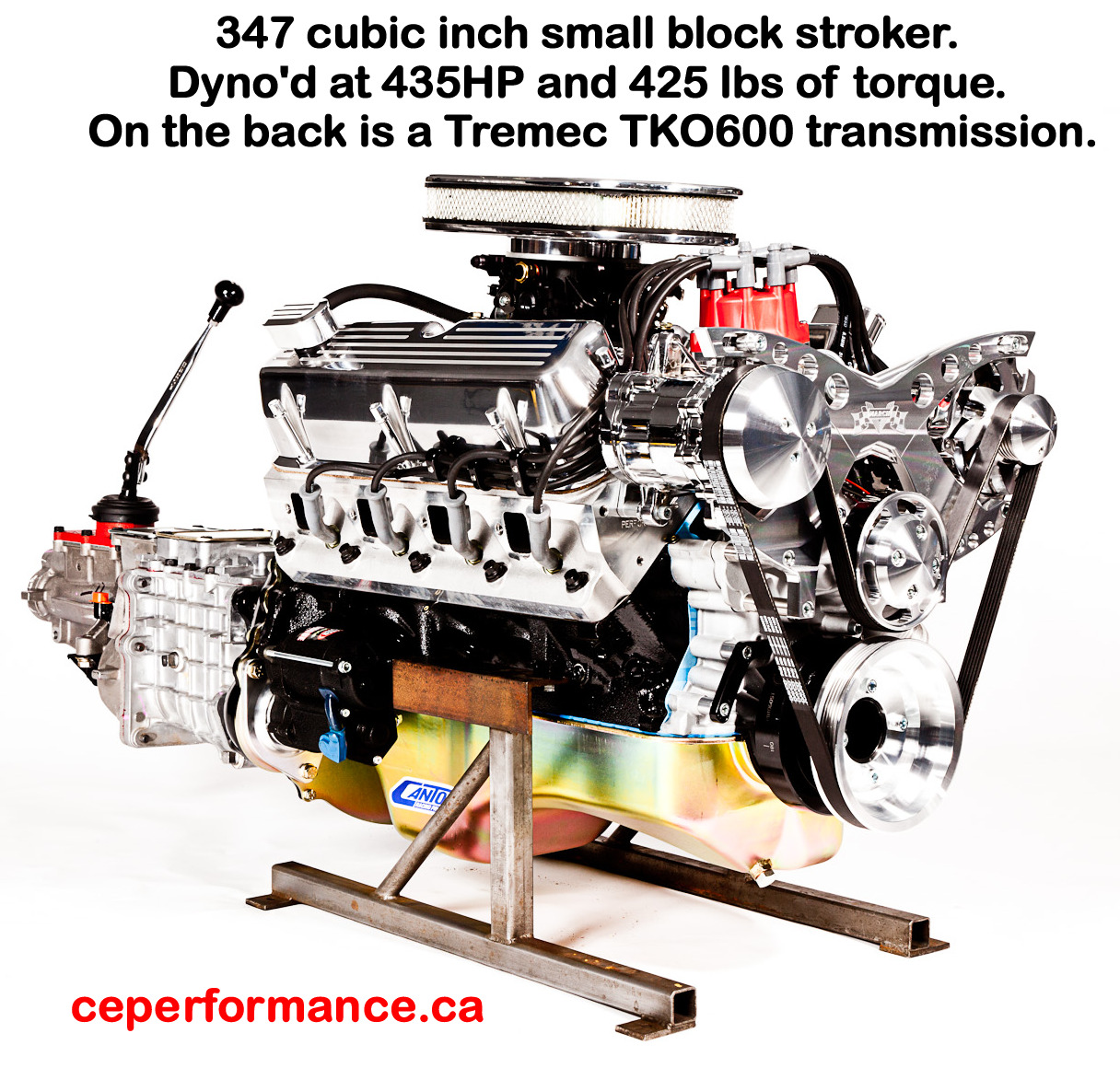 The engine and transmission package is one CE Performance built for a "Factory 5" 1965 Daytona Coupe. It is a 347 cubic inch small block stroker. It made 435HP and 425 lbs of torque. On the back is a Tremec TKO600 transmission.