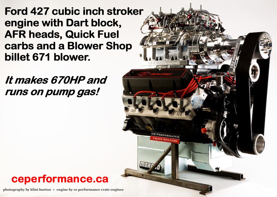 This CE Performance Ford engine with a 671 Blower is a 427 cubic inch stroker with a Dart block, AFR heads, Quick Fuel carbs and a Blower Shop billet 671 blower. It is going into a sweet 1956 Ford pick up.
